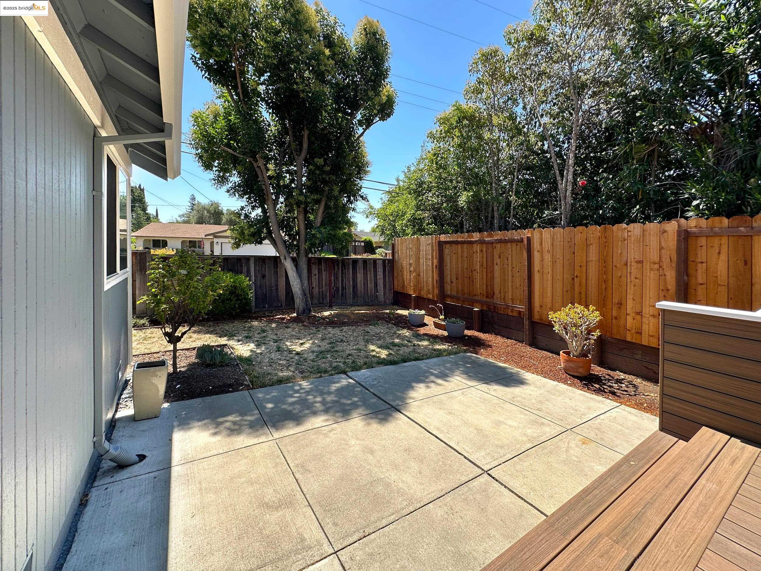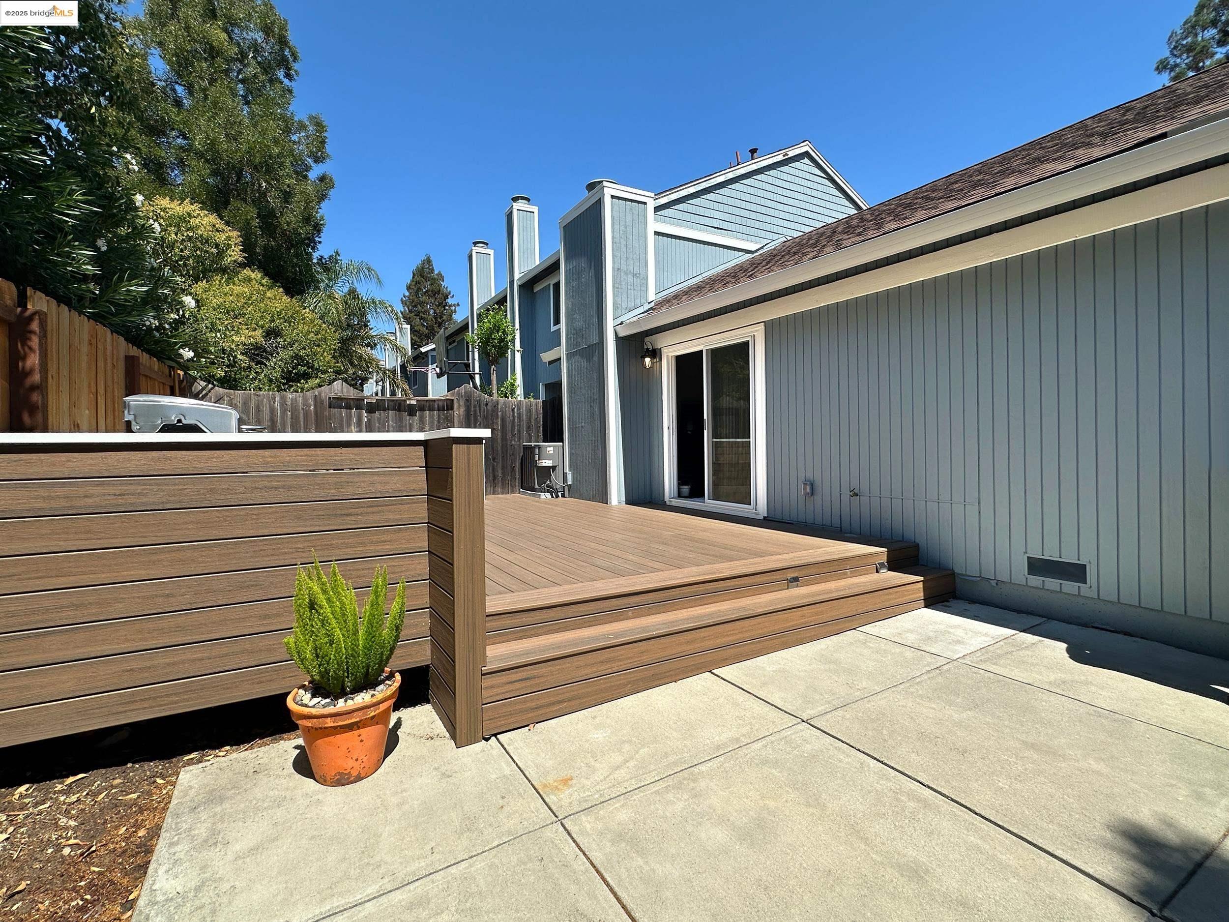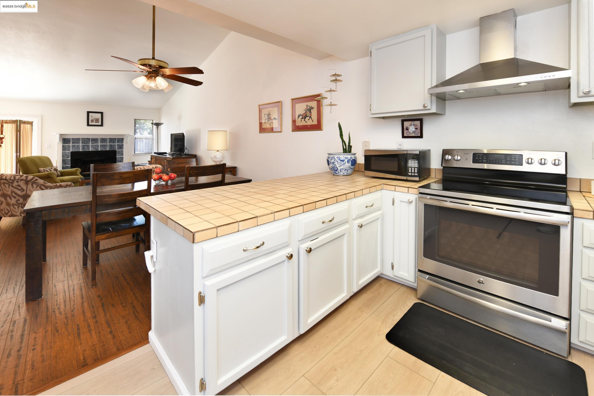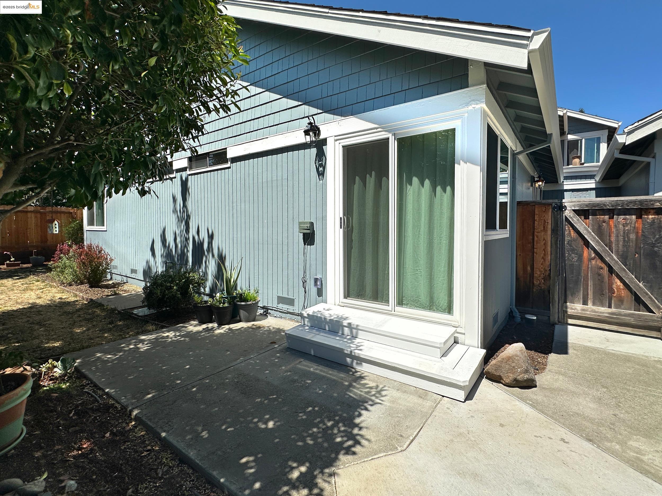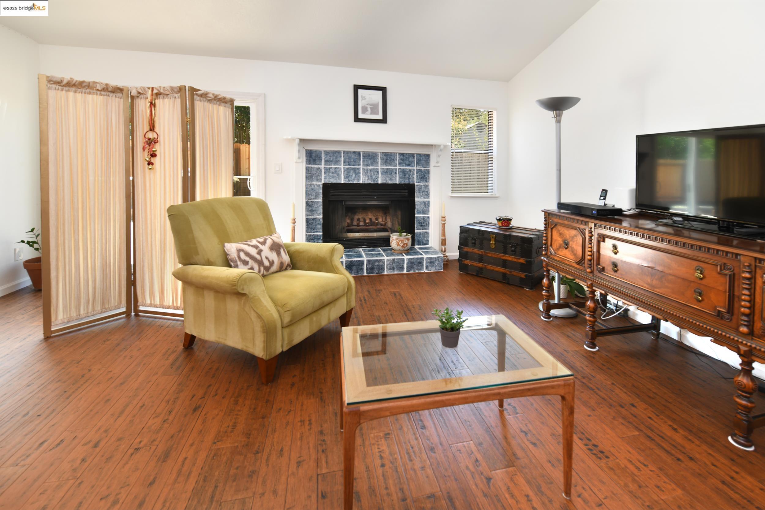 Charming end-unit in Donegal Place on the Pleasant Hill border! This single-story 2BD/2BA home (~1,285 sq ft) offers vaulted ceilings in the living room & primary suite, cozy fireplace, energy-efficient dual-pane windows/doors, and laminate flooring throughout. Kitchen features tiled counters, dual stainless sink, stainless steel fridge, dishwasher & electric oven/stove. Dining area with ceiling fan/light & built-in bookshelves. Primary bath boasts dual sink vanity & step-in shower. Includes laundry room with washer/dryer and 2-car garage with interior access. One of the largest lots in complex with deck for entertaining and garden/play area. Close to shopping, transit, and the charm of Martinez & Pleasant Hill.