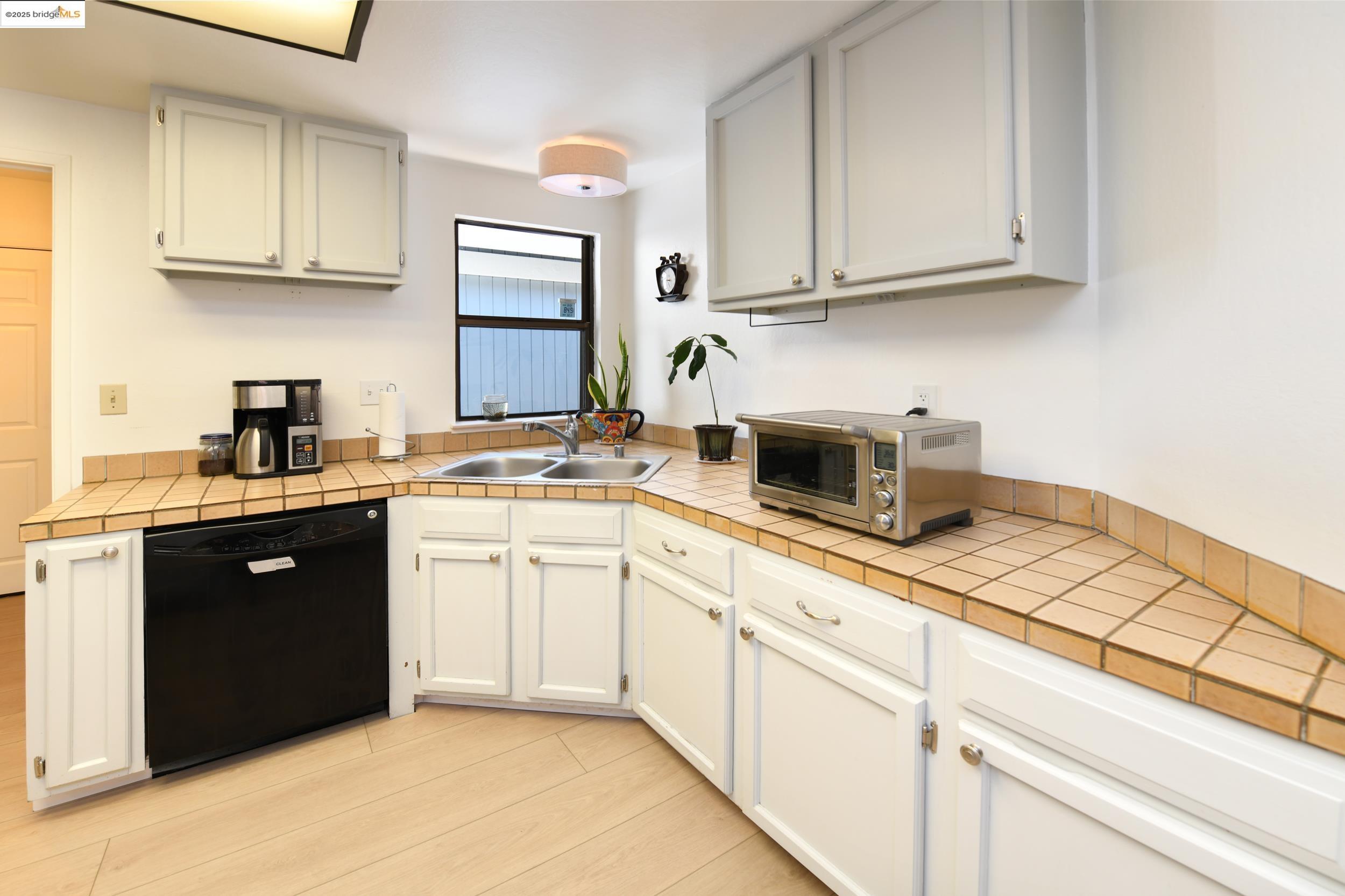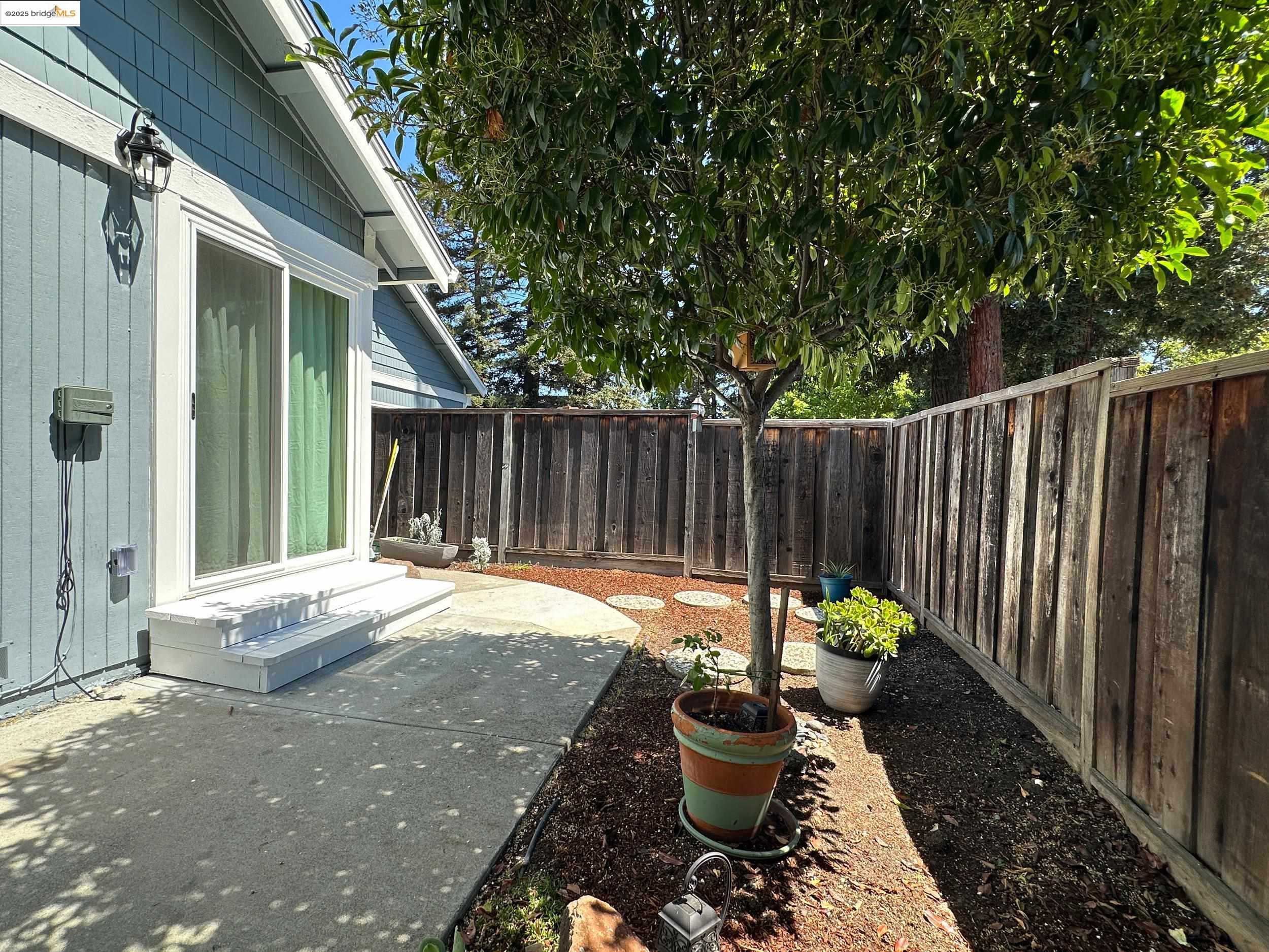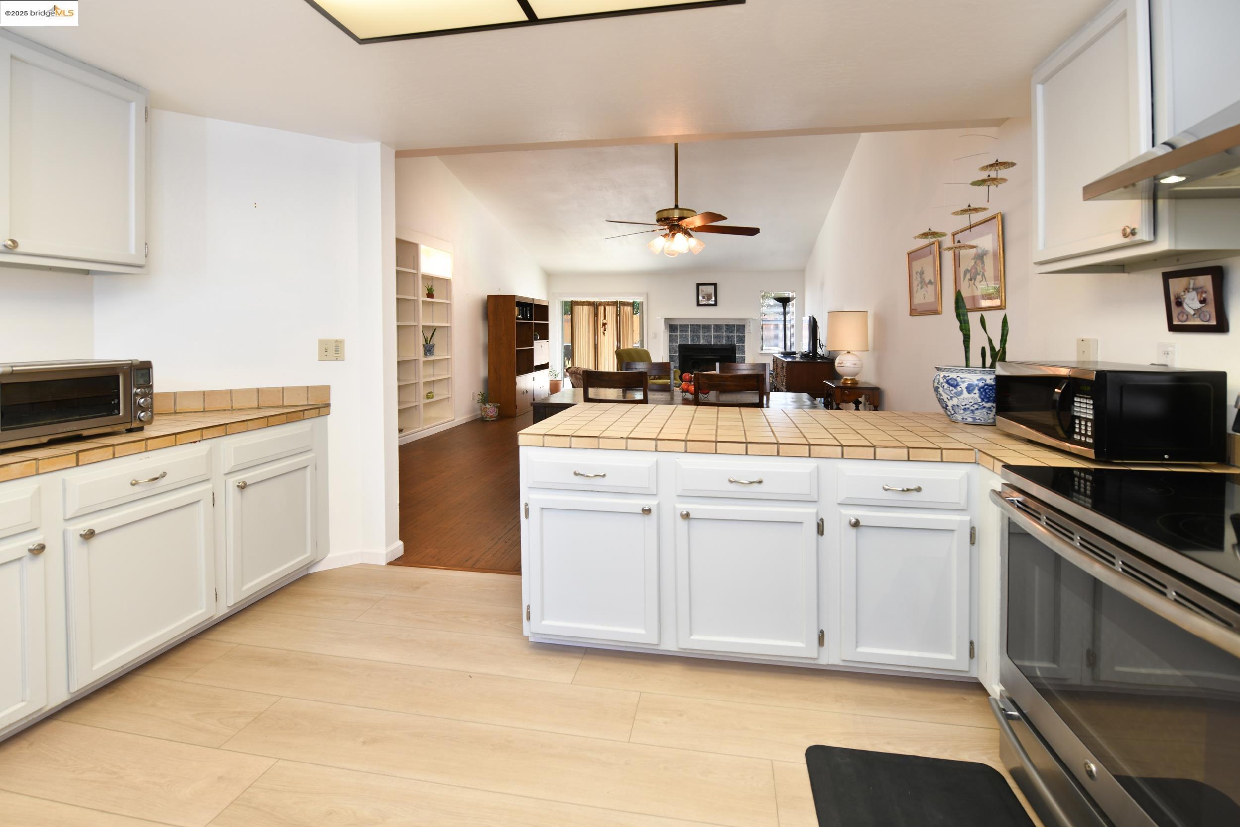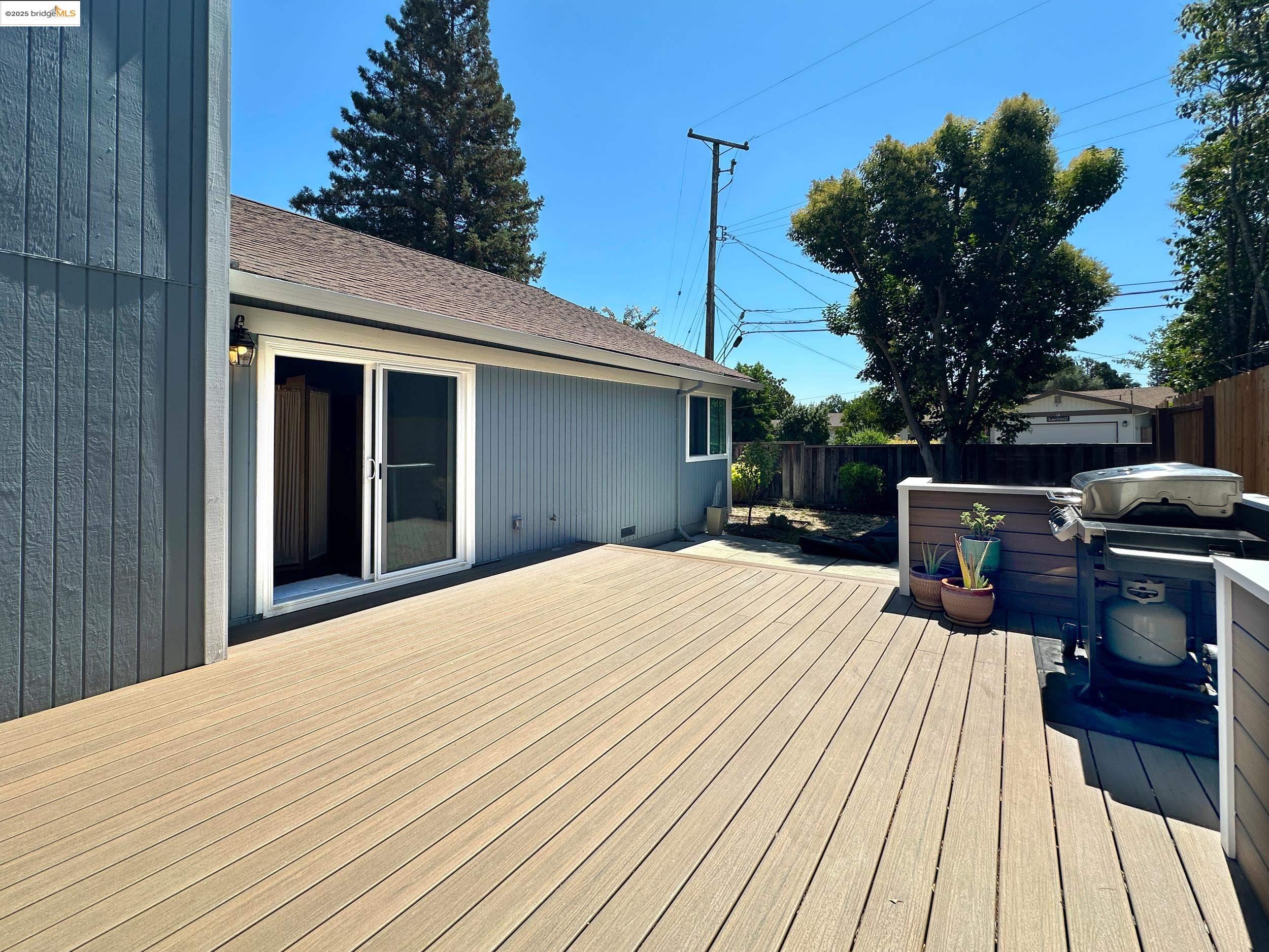 Charming end-unit in Donegal Place on the Pleasant Hill border! This single-story 2BD/2BA home (~1,285 sq ft) offers vaulted ceilings in the living room & primary suite, cozy fireplace, energy-efficient dual-pane windows/doors, and laminate flooring throughout. Kitchen features tiled counters, dual stainless sink, stainless steel fridge, dishwasher & electric oven/stove. Dining area with ceiling fan/light & built-in bookshelves. Primary bath boasts dual sink vanity & step-in shower. Includes laundry room with washer/dryer and 2-car garage with interior access. One of the largest lots in complex with deck for entertaining and garden/play area. Close to shopping, transit, and the charm of Martinez & Pleasant Hill.