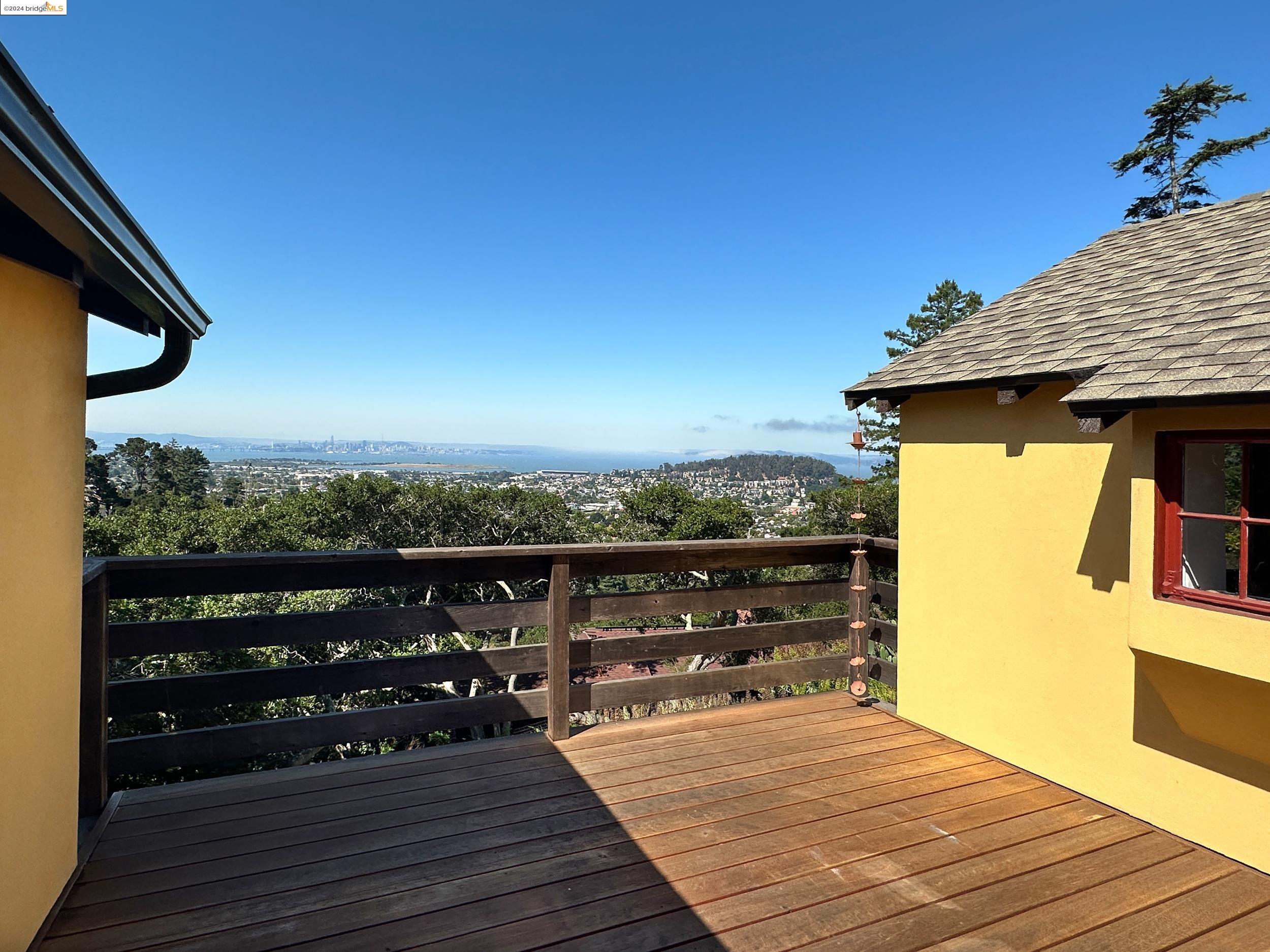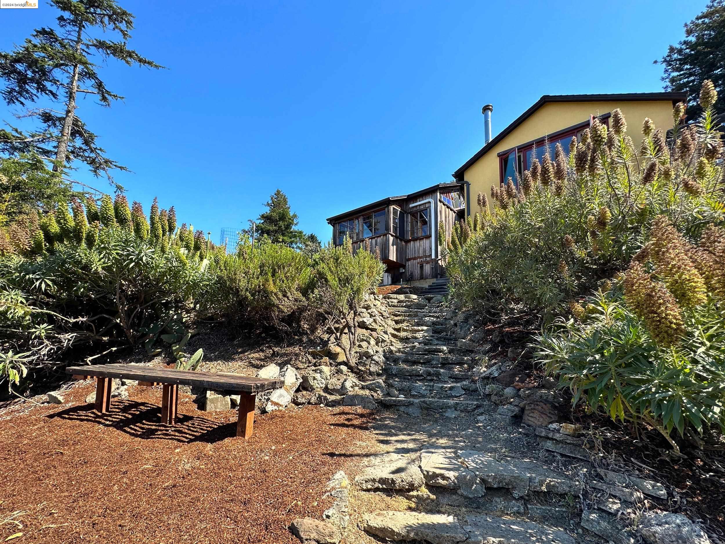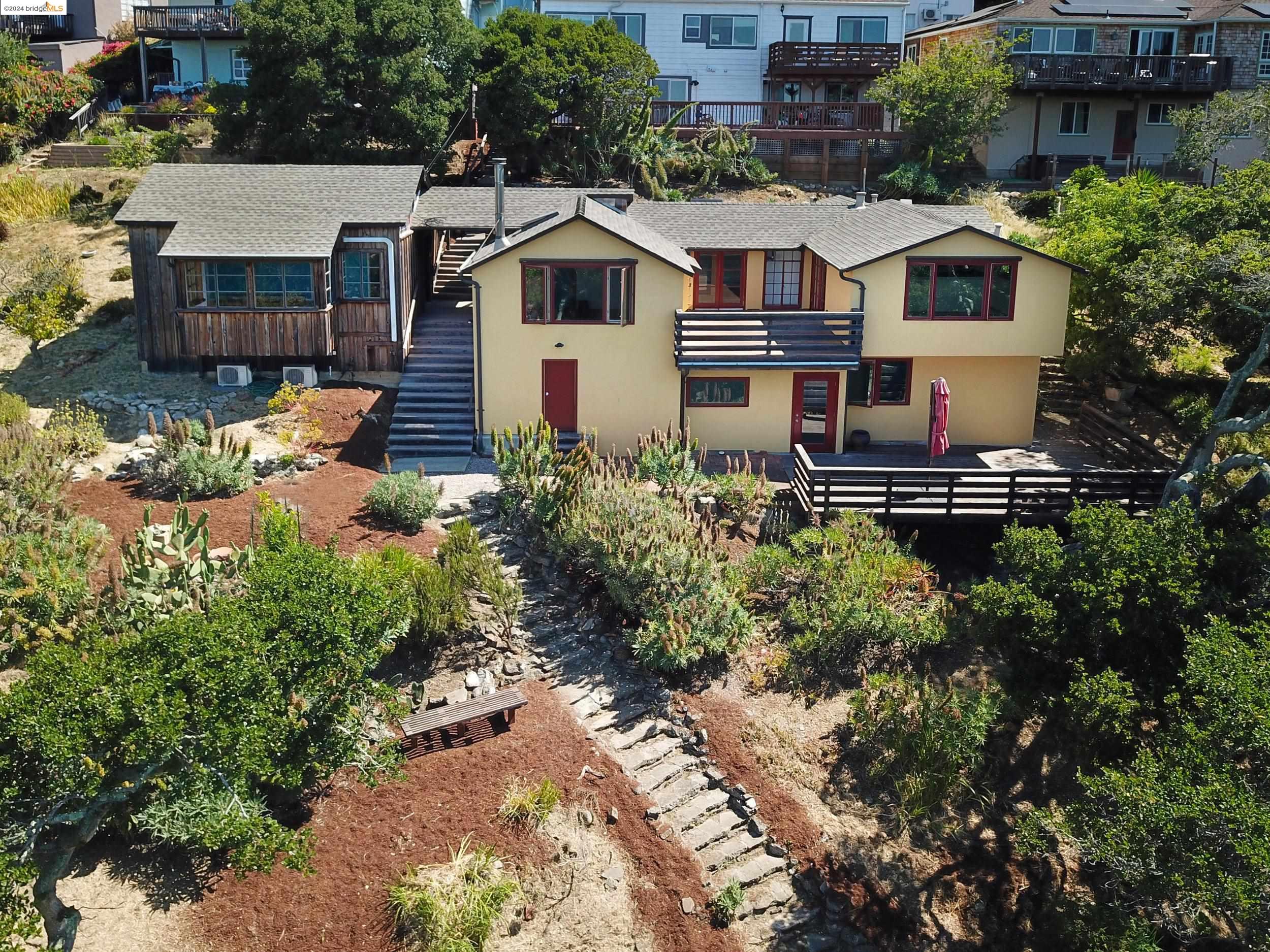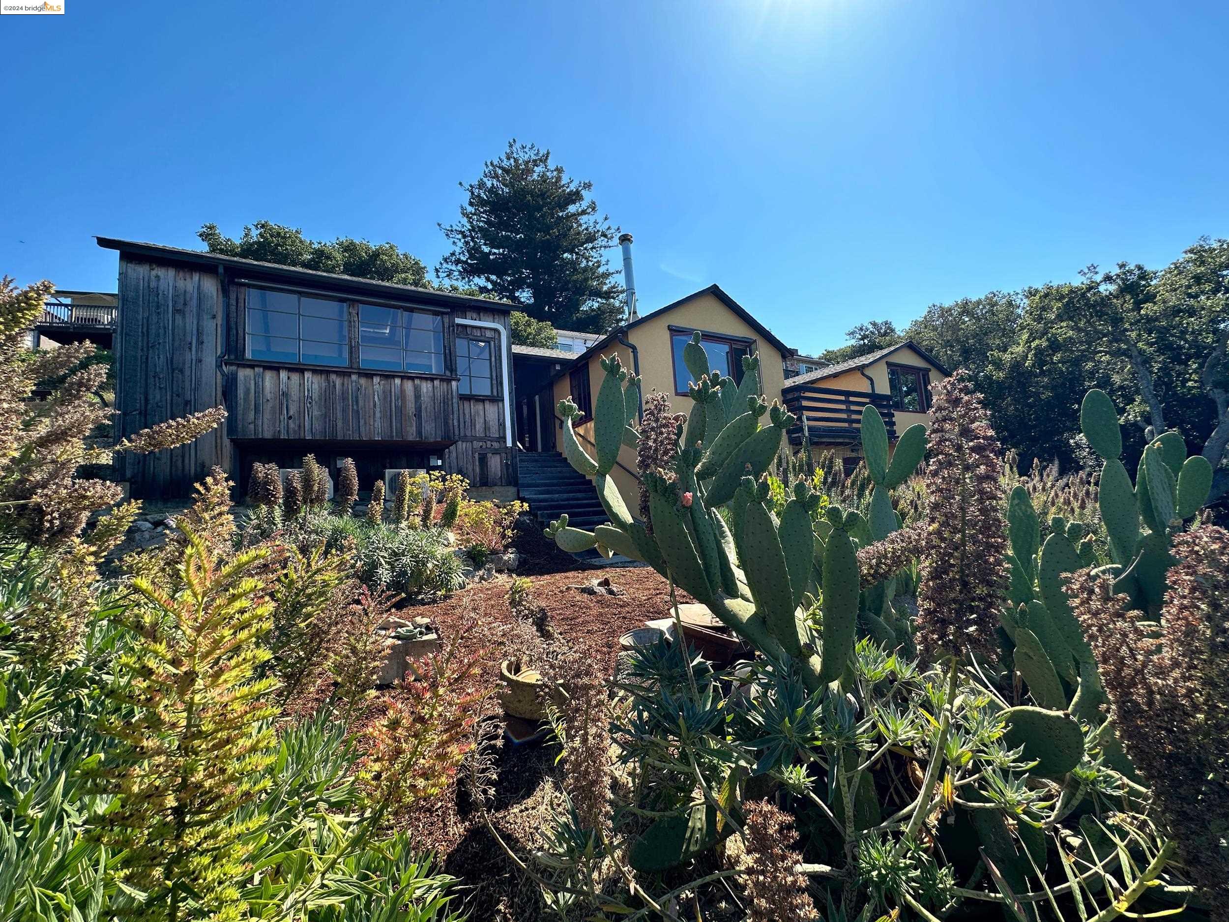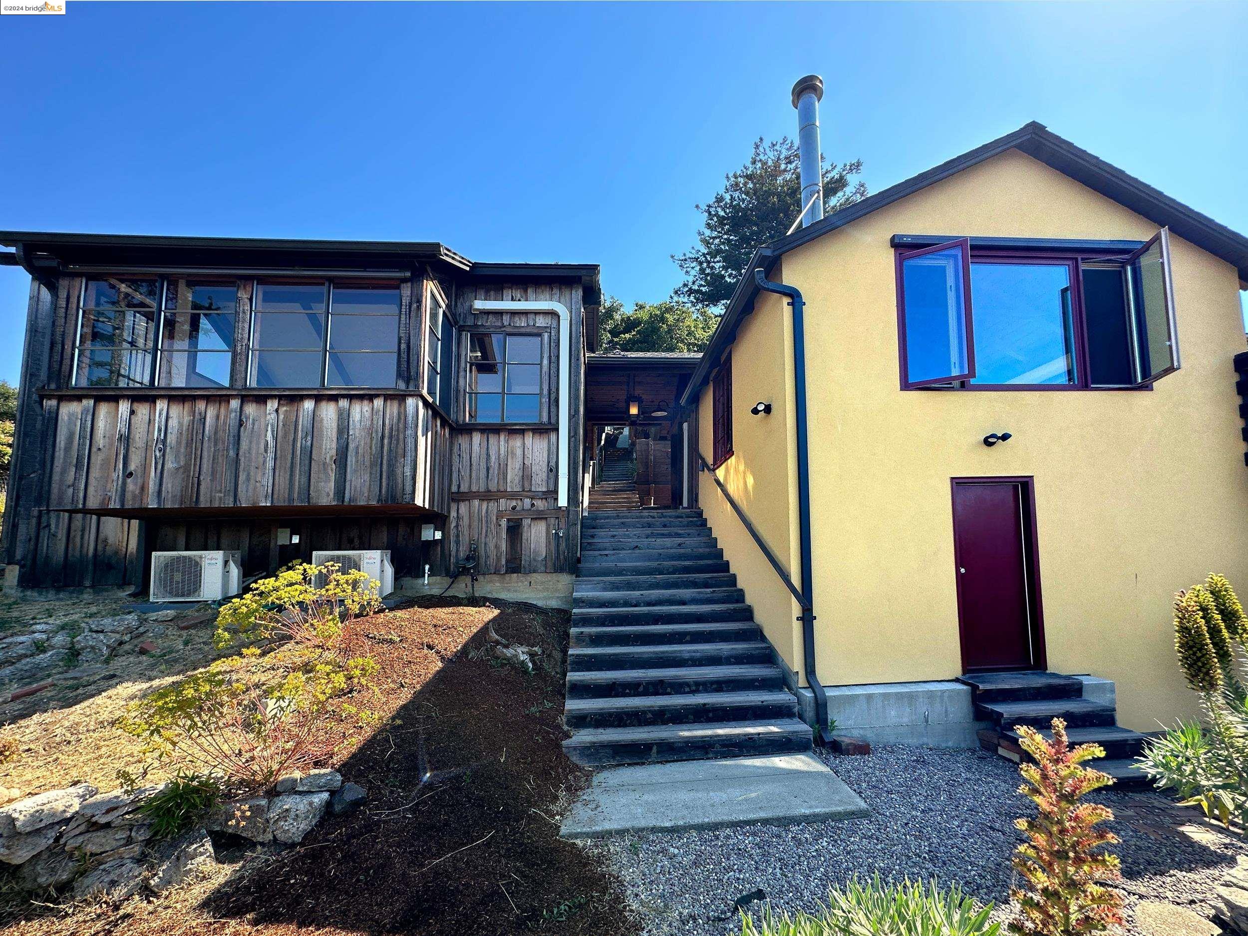 A beautifully unique and inspiring retreat built in 1924 and modernized in 2019. Nestled on over a quarter-acre, private hillside in central Kensington, this 3-bedroom, 3.5-bathroom single-family residence offers 1,875 square feet of bright and airy living space, set on an expansive 11,410 square foot lot. The property boasts a fruitful orchard with persimmons, lemons, and apple trees, a serene oak forest, a tranquil bamboo grove, and ample sunlight and space for flourishing vegetable gardens. This home, perfect for those seeking tranquility, combines eclectic architecture and farmhouse styles with modern updates. The exterior showcases board and batten-weathered redwood, while the interior exudes warmth with a white-weathered finish and stained glass accents. This two-story abode is a sanctuary of light, lush surroundings, and stunning cityscapes. Every detail has been thoughtfully enhanced since 2019, with over $400,000 in updates including Nest smart control, a central alarm system, new exterior walls and insulation, ACME solar-powered retractable awnings, along with mini-split heat and AC units. Additional updates include newly replaced foundations, seismic retrofitting, new skylights, upgraded electrical and plumbing systems, as well as Marvin Signature windows.