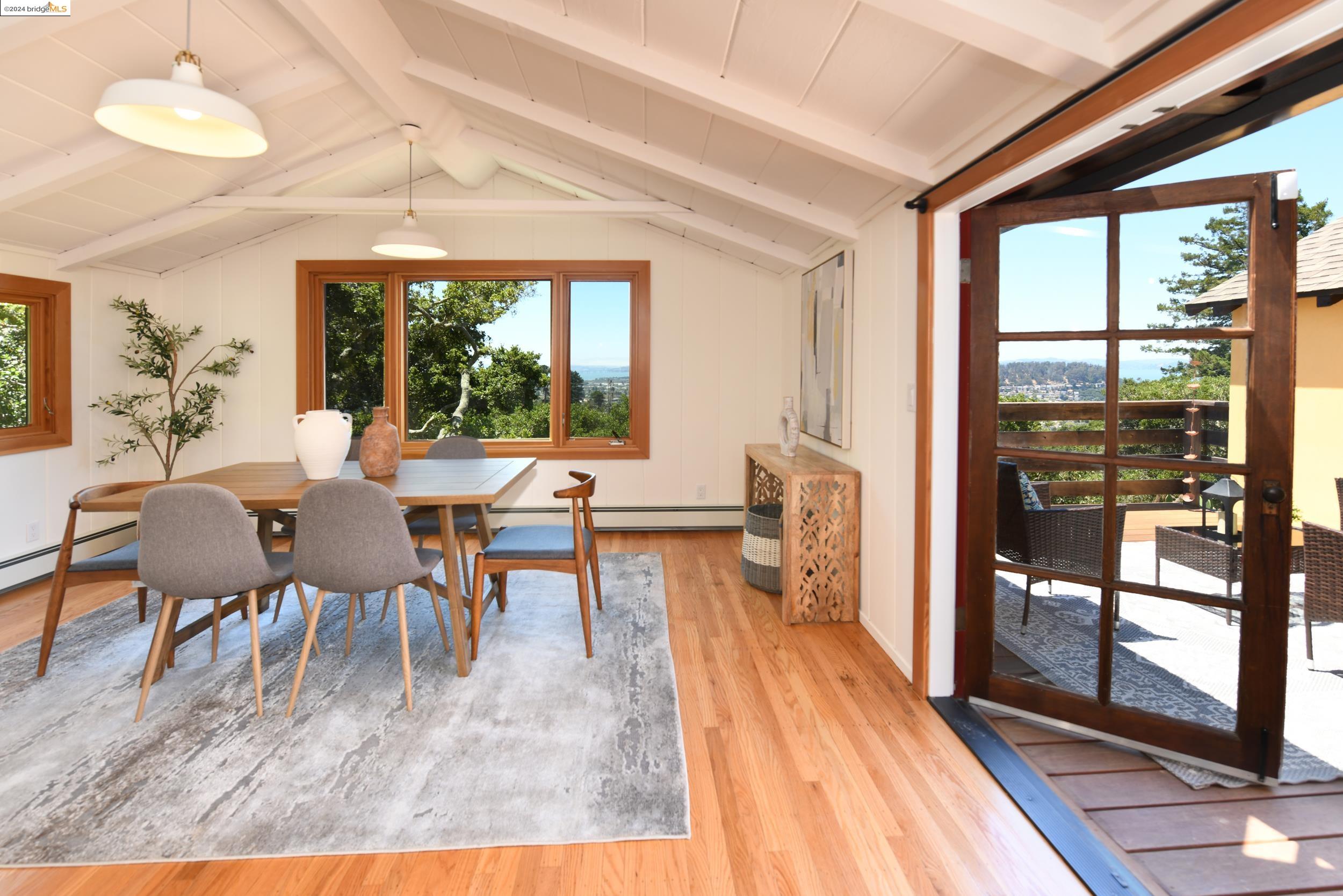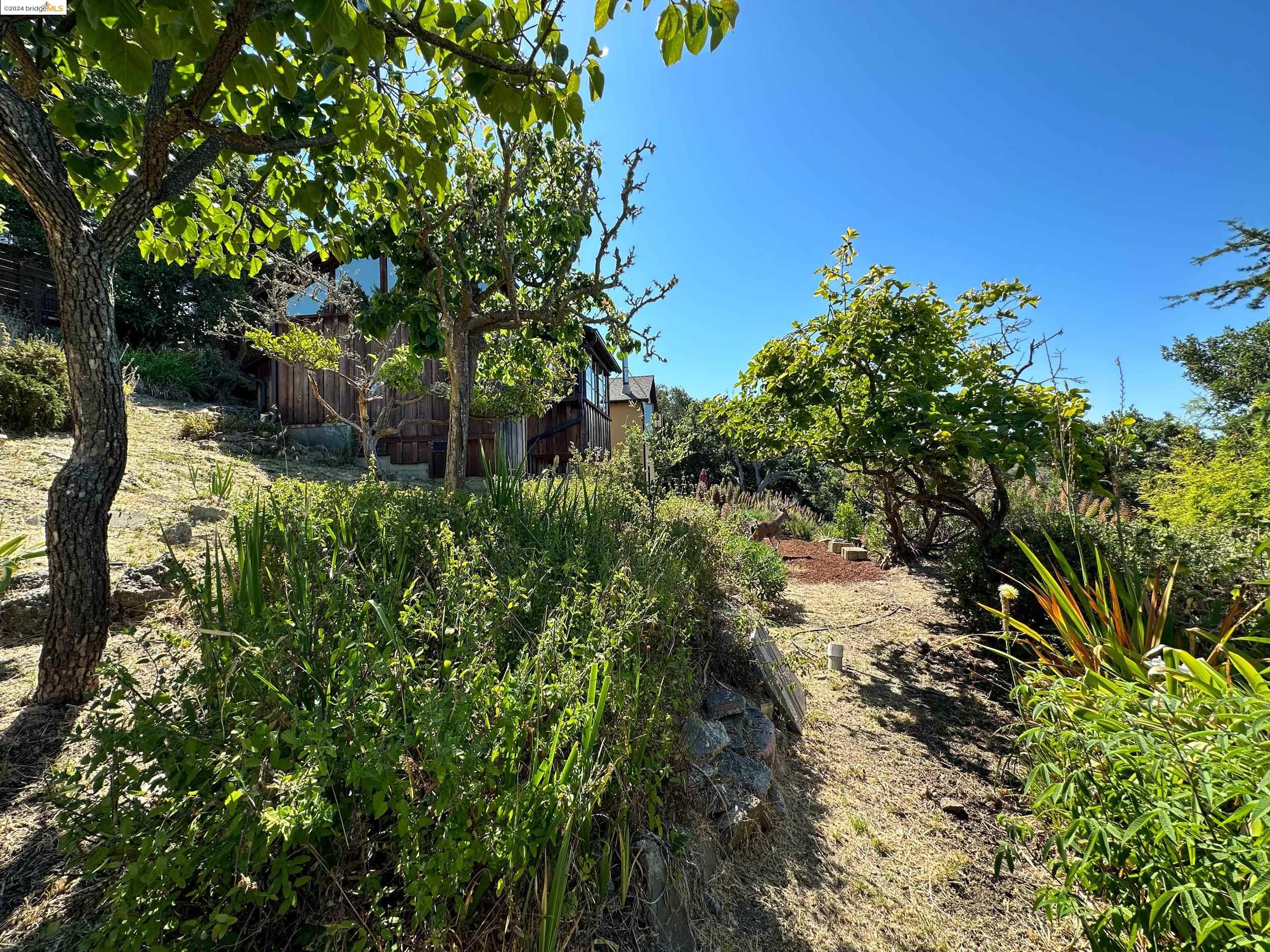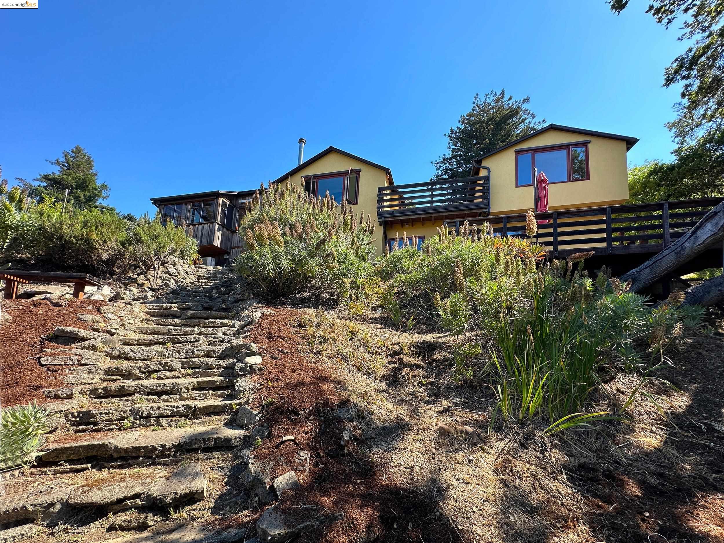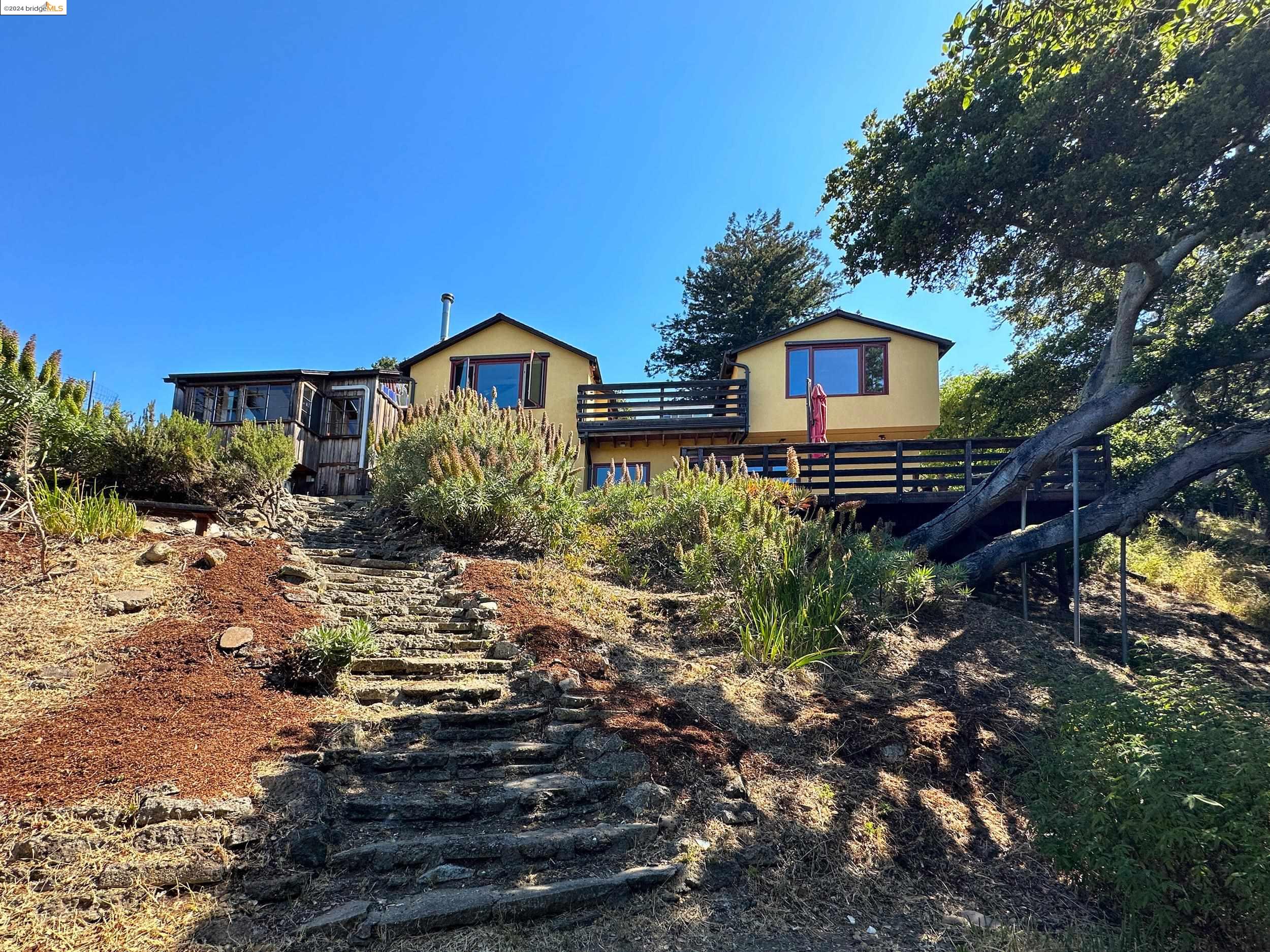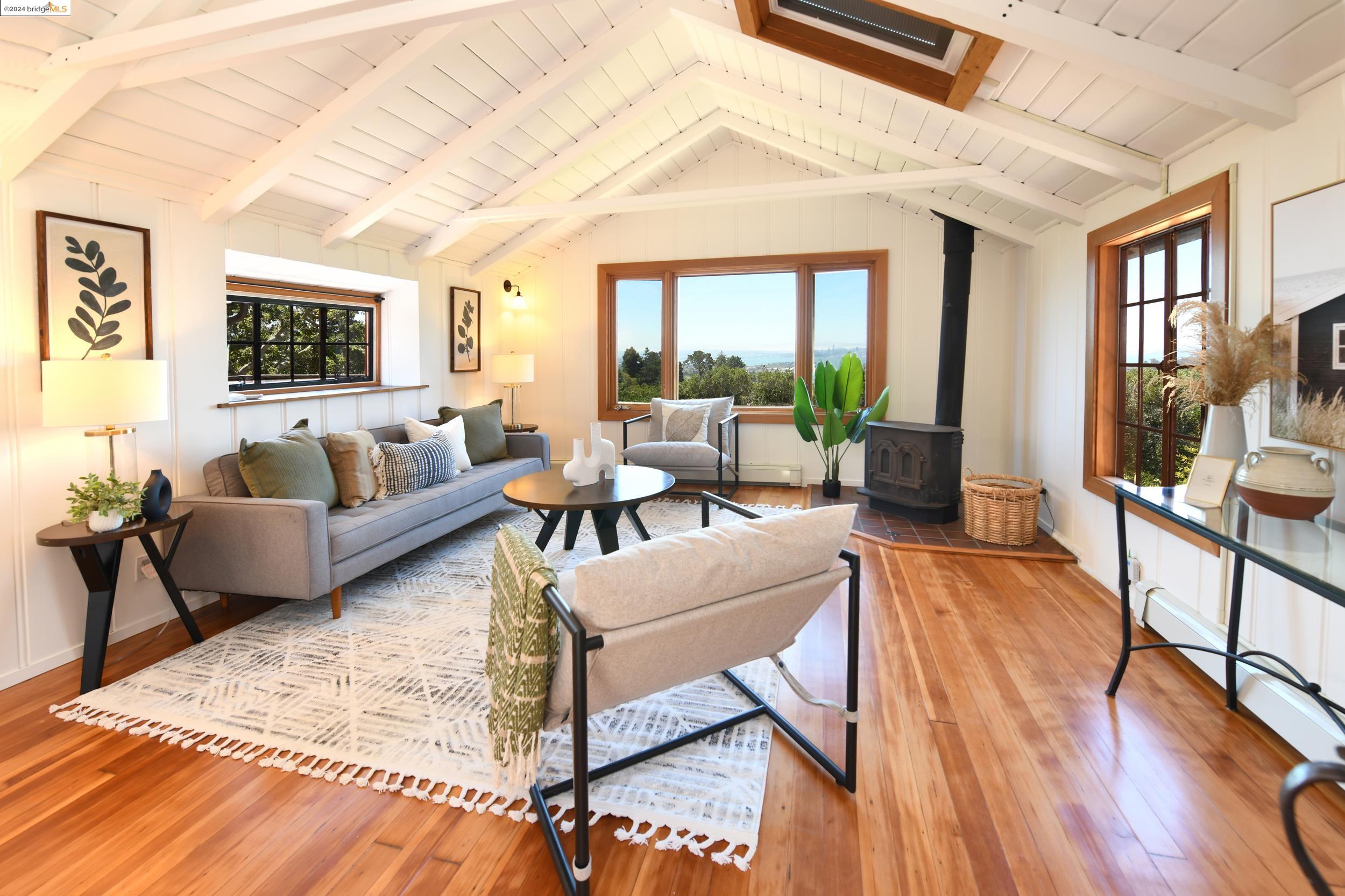 A beautifully unique and inspiring retreat built in 1924 and modernized in 2019. Nestled on over a quarter-acre, private hillside in central Kensington, this 3-bedroom, 3.5-bathroom single-family residence offers 1,875 square feet of bright and airy living space, set on an expansive 11,410 square foot lot. The property boasts a fruitful orchard with persimmons, lemons, and apple trees, a serene oak forest, a tranquil bamboo grove, and ample sunlight and space for flourishing vegetable gardens. This home, perfect for those seeking tranquility, combines eclectic architecture and farmhouse styles with modern updates. The exterior showcases board and batten-weathered redwood, while the interior exudes warmth with a white-weathered finish and stained glass accents. This two-story abode is a sanctuary of light, lush surroundings, and stunning cityscapes. Every detail has been thoughtfully enhanced since 2019, with over $400,000 in updates including Nest smart control, a central alarm system, new exterior walls and insulation, ACME solar-powered retractable awnings, along with mini-split heat and AC units. Additional updates include newly replaced foundations, seismic retrofitting, new skylights, upgraded electrical and plumbing systems, as well as Marvin Signature windows.