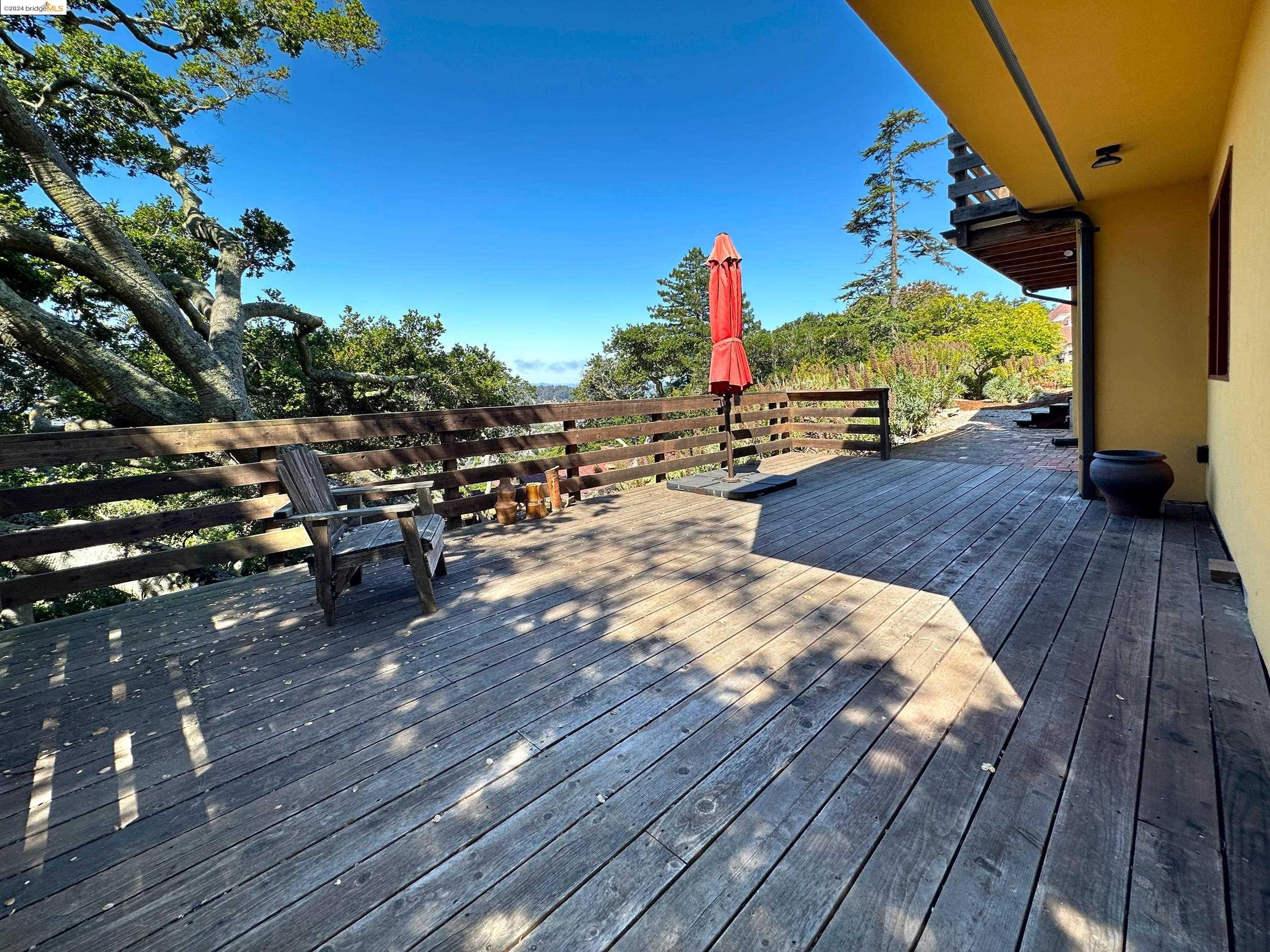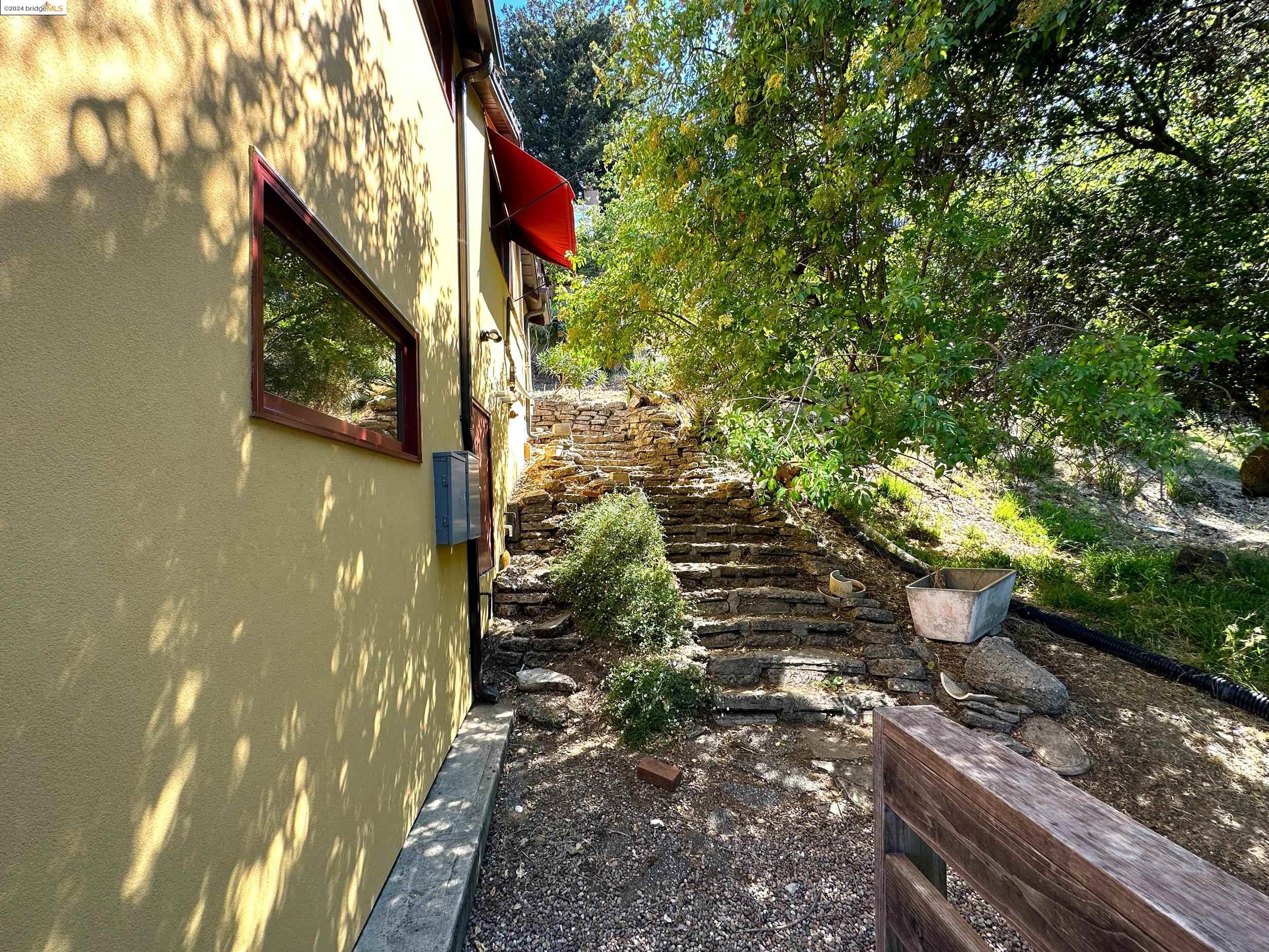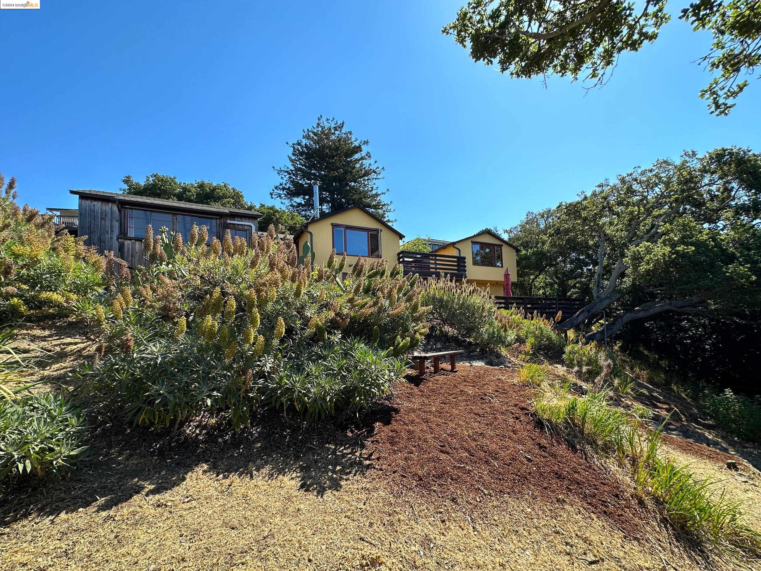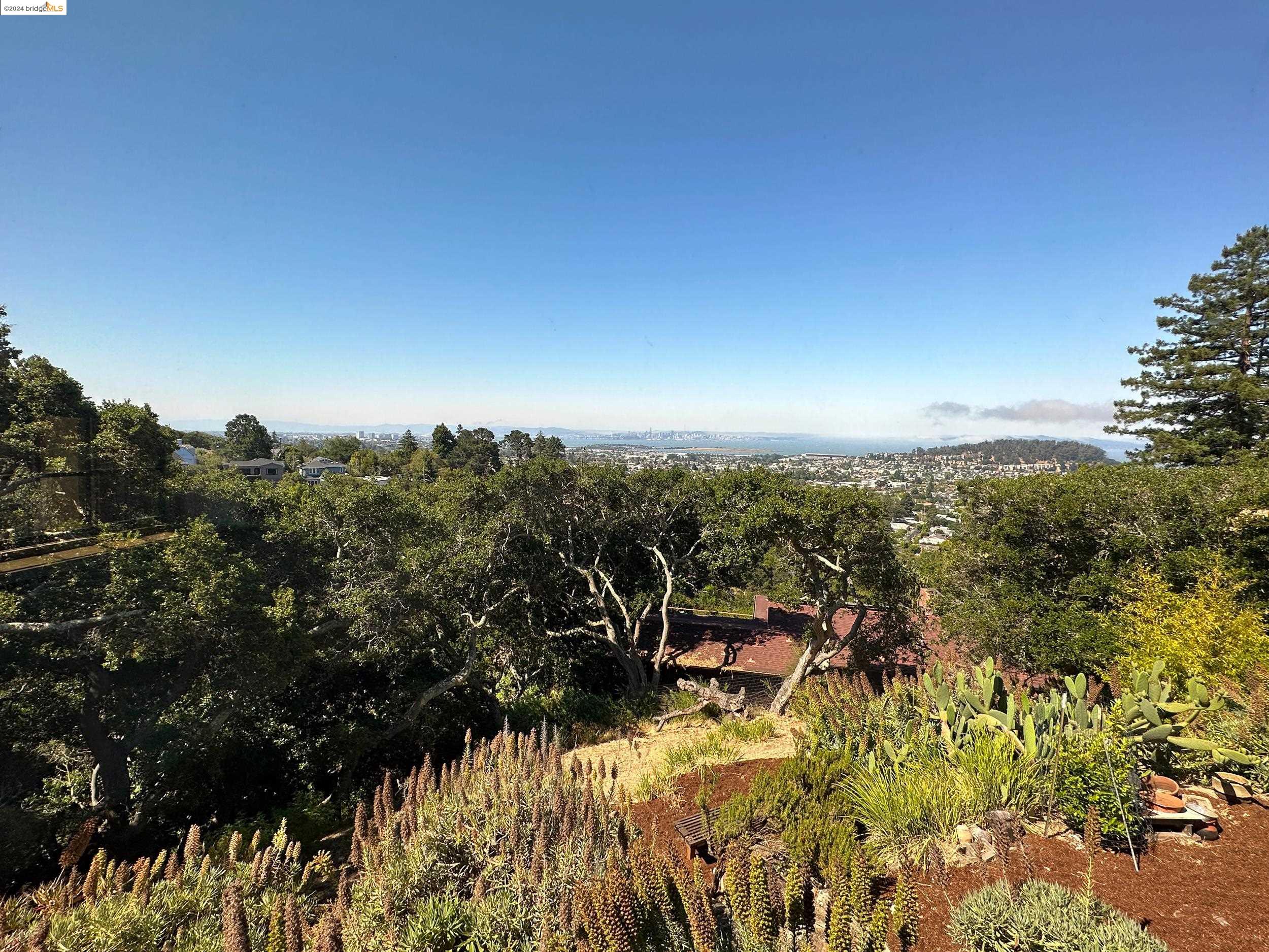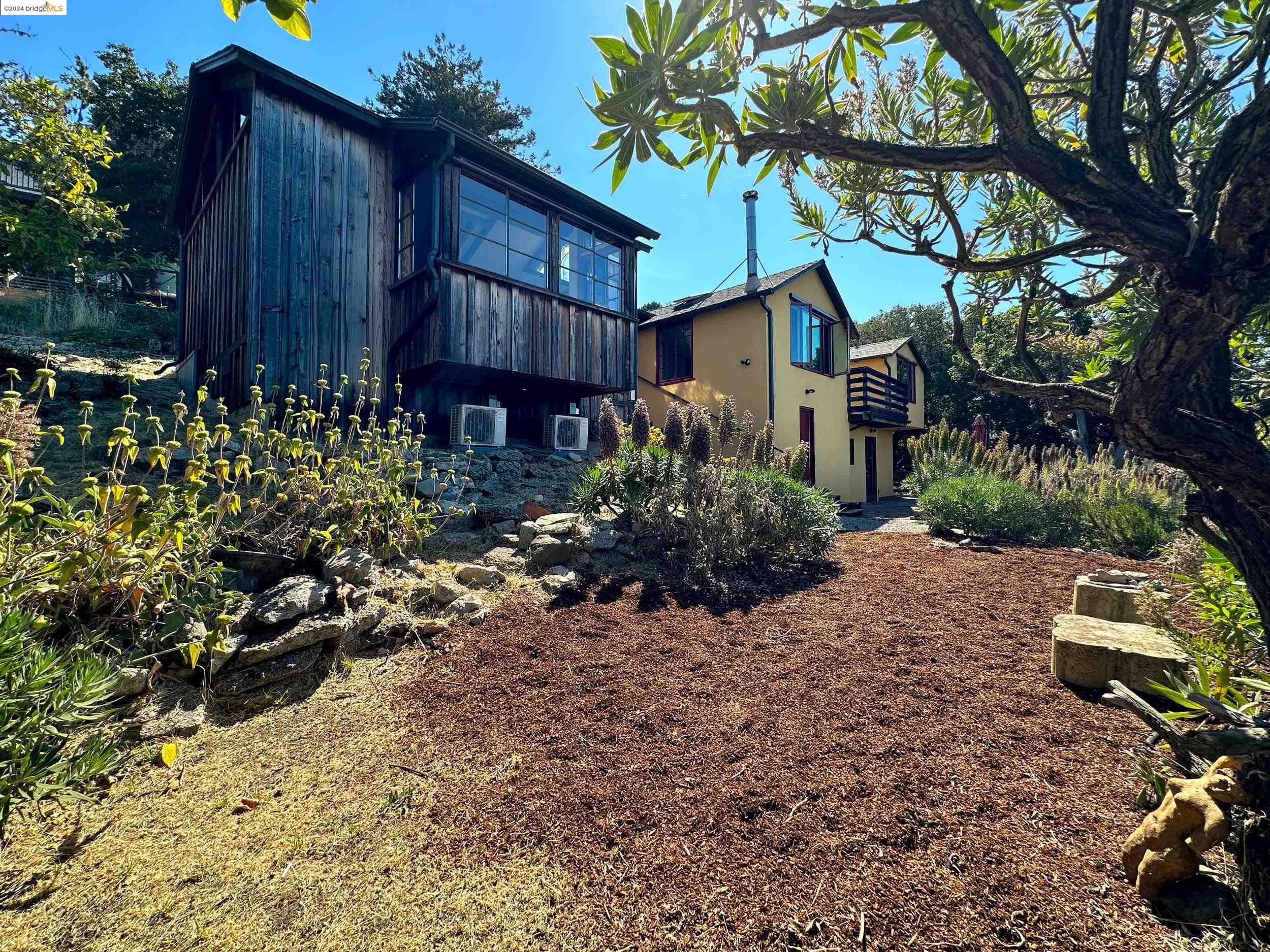 A beautifully unique and inspiring retreat built in 1924 and modernized in 2019. Nestled on over a quarter-acre, private hillside in central Kensington, this 3-bedroom, 3.5-bathroom single-family residence offers 1,875 square feet of bright and airy living space, set on an expansive 11,410 square foot lot. The property boasts a fruitful orchard with persimmons, lemons, and apple trees, a serene oak forest, a tranquil bamboo grove, and ample sunlight and space for flourishing vegetable gardens. This home, perfect for those seeking tranquility, combines eclectic architecture and farmhouse styles with modern updates. The exterior showcases board and batten-weathered redwood, while the interior exudes warmth with a white-weathered finish and stained glass accents. This two-story abode is a sanctuary of light, lush surroundings, and stunning cityscapes. Every detail has been thoughtfully enhanced since 2019, with over $400,000 in updates including Nest smart control, a central alarm system, new exterior walls and insulation, ACME solar-powered retractable awnings, along with mini-split heat and AC units. Additional updates include newly replaced foundations, seismic retrofitting, new skylights, upgraded electrical and plumbing systems, as well as Marvin Signature windows.