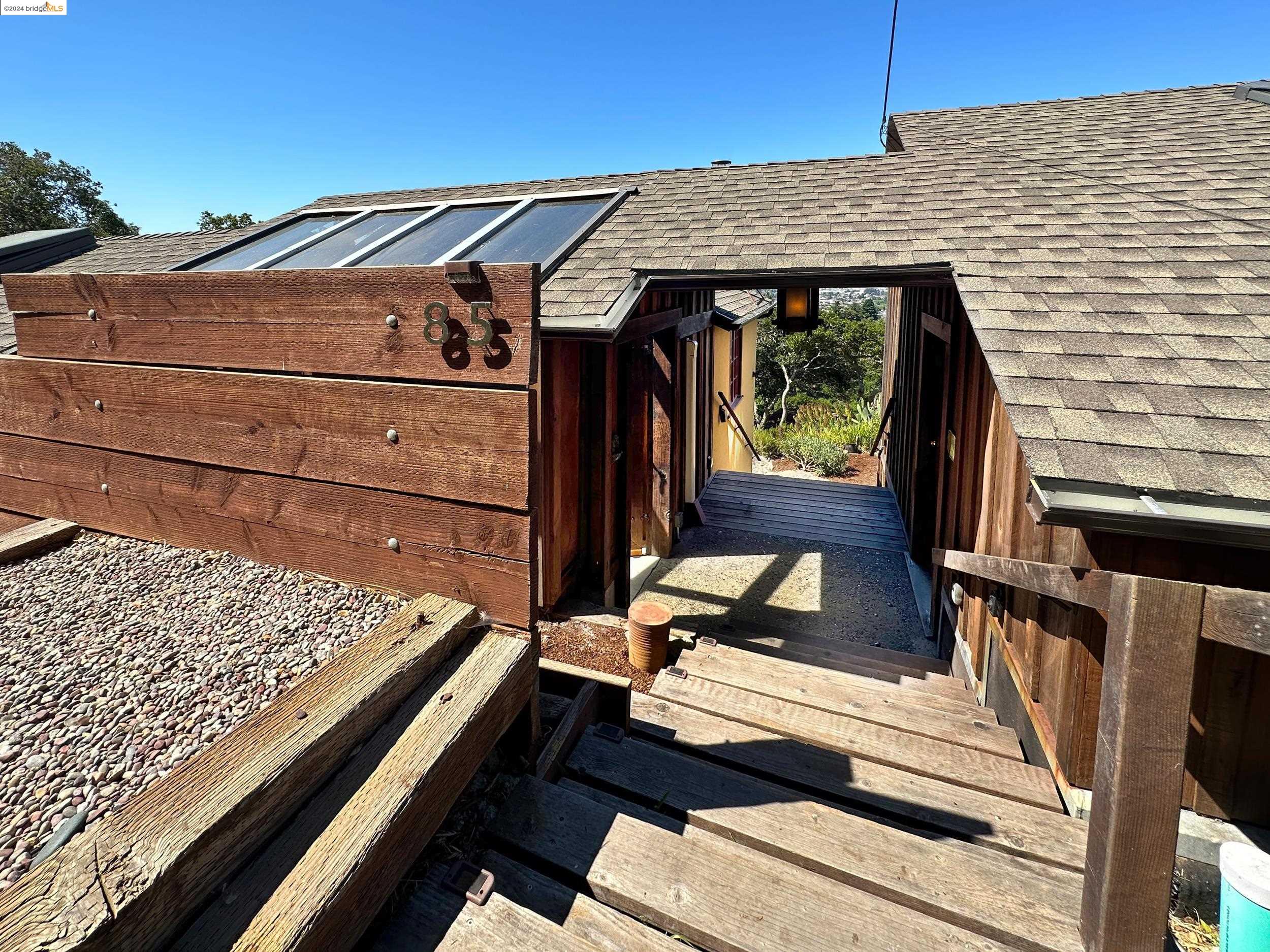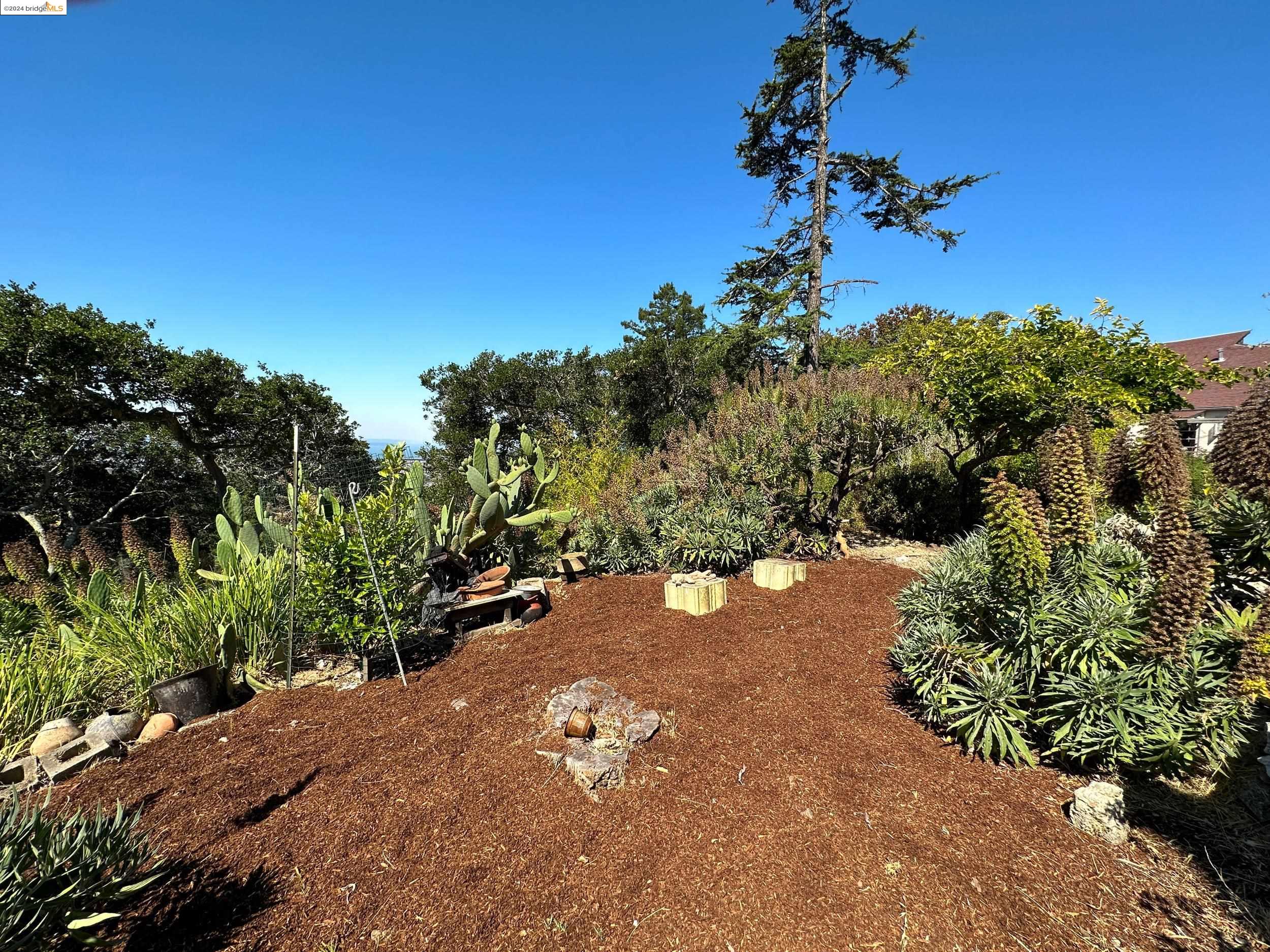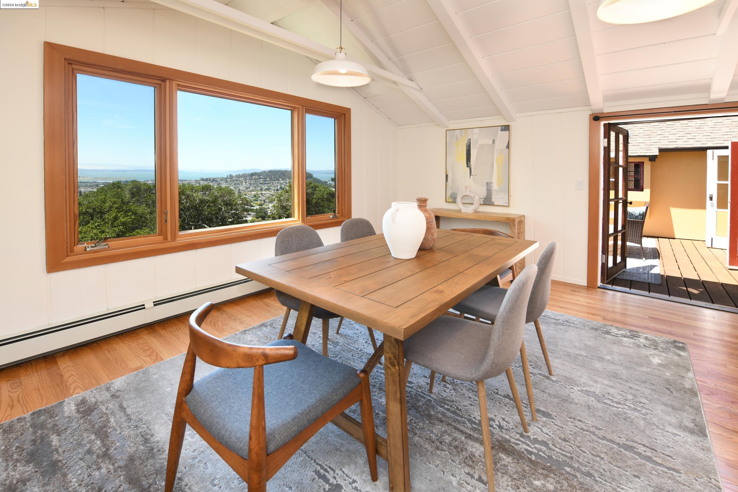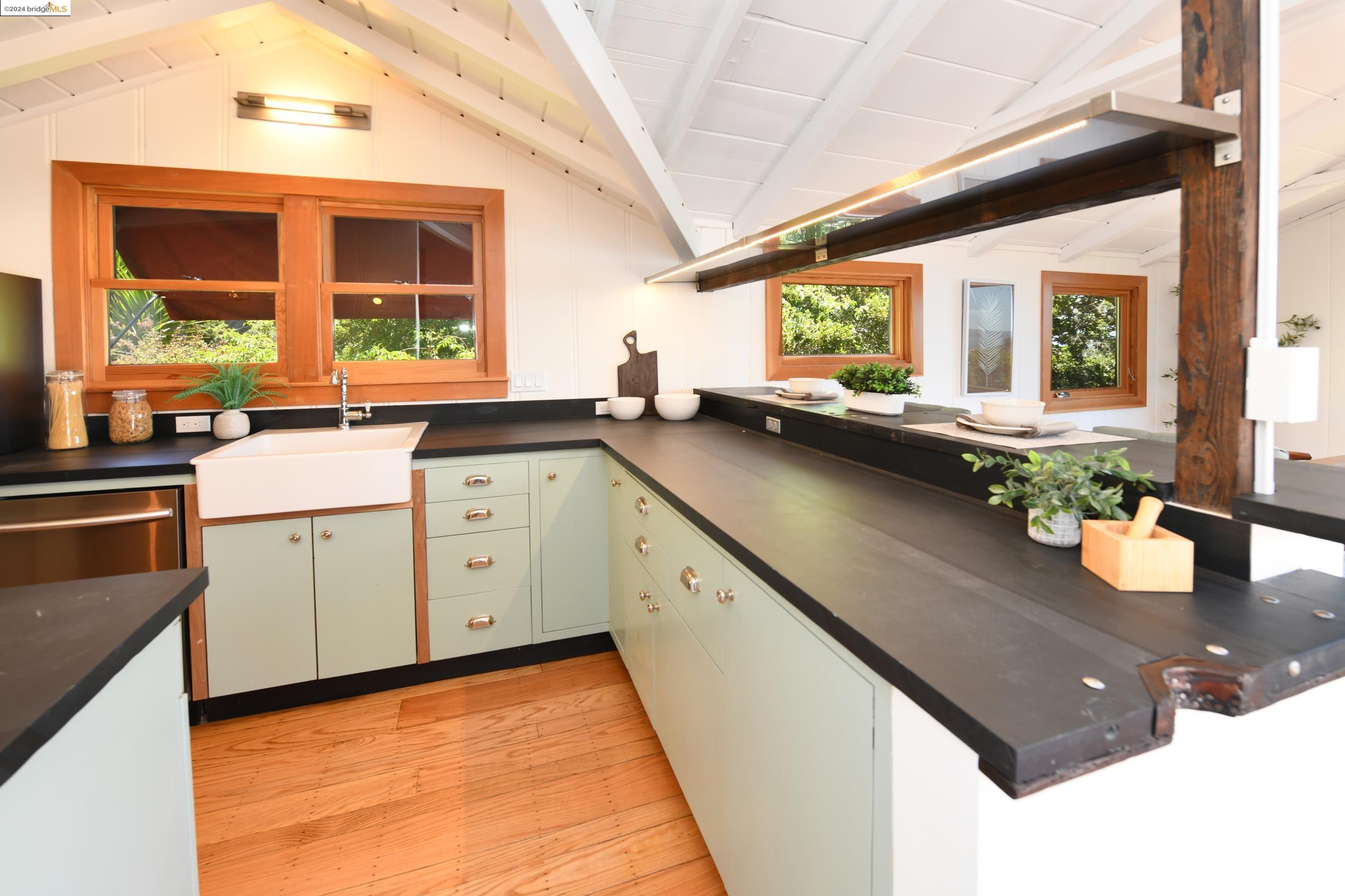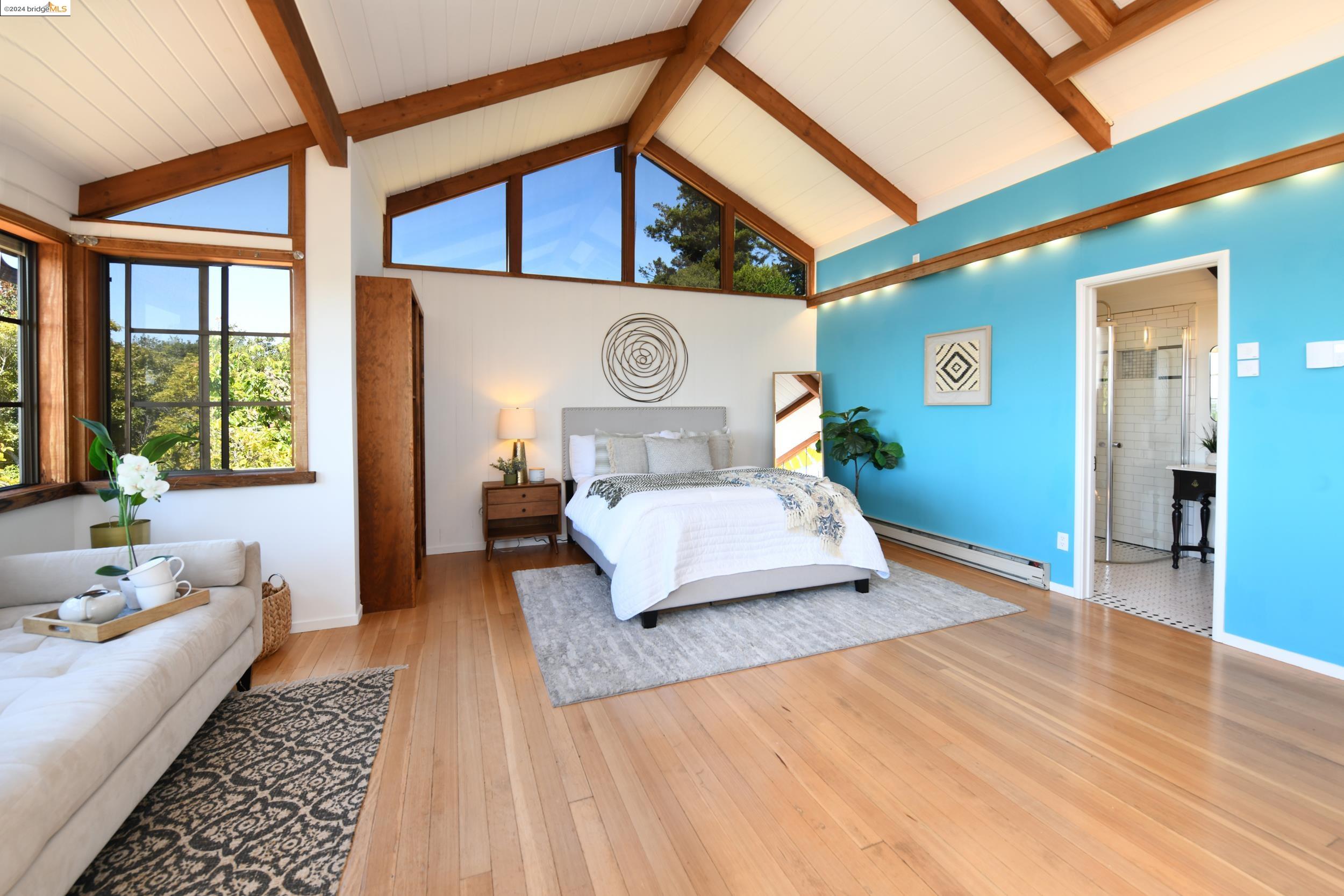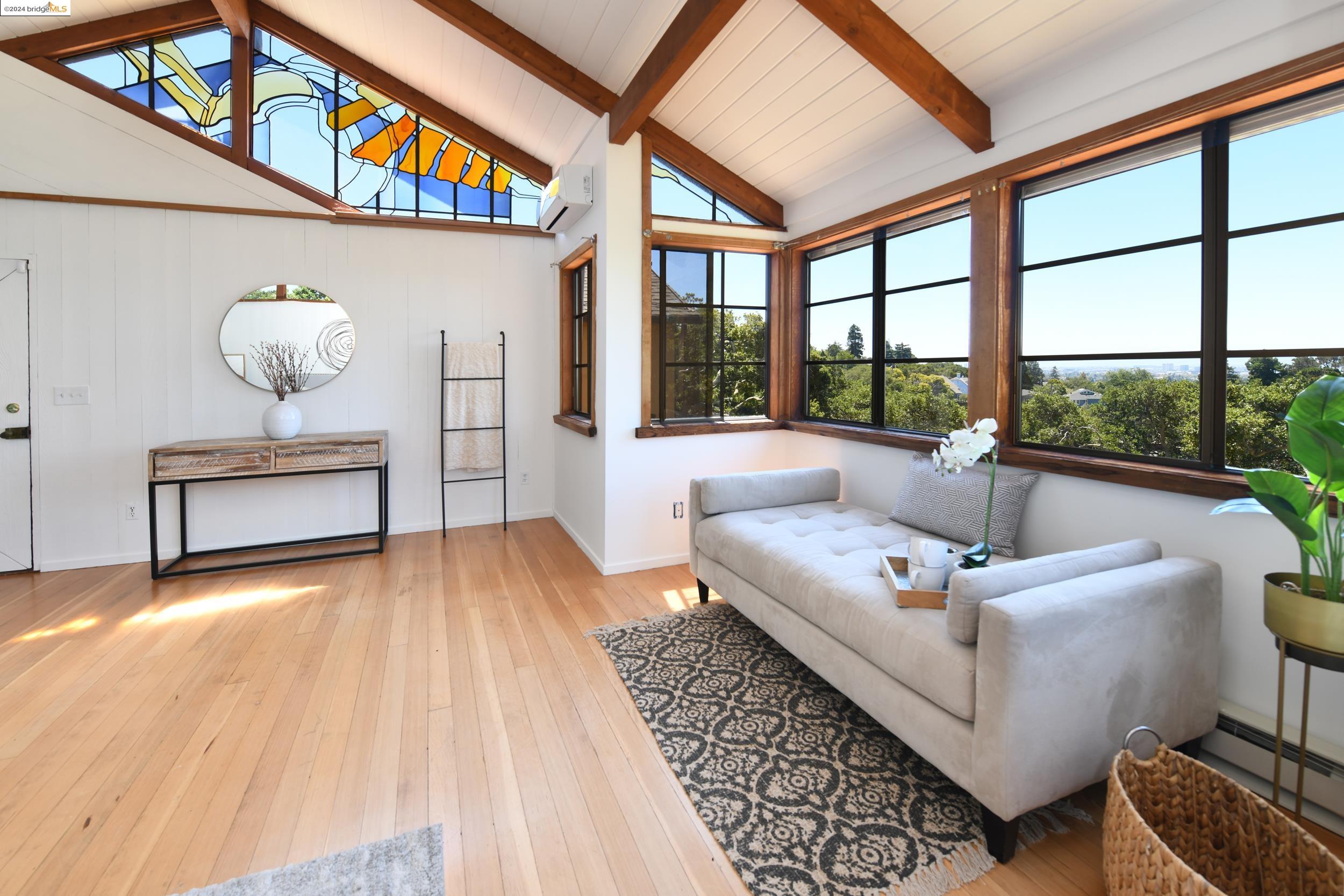 A beautifully unique and inspiring retreat built in 1924 and modernized in 2019. Nestled on over a quarter-acre, private hillside in central Kensington, this 3-bedroom, 3.5-bathroom single-family residence offers 1,875 square feet of bright and airy living space, set on an expansive 11,410 square foot lot. The property boasts a fruitful orchard with persimmons, lemons, and apple trees, a serene oak forest, a tranquil bamboo grove, and ample sunlight and space for flourishing vegetable gardens. This home, perfect for those seeking tranquility, combines eclectic architecture and farmhouse styles with modern updates. The exterior showcases board and batten-weathered redwood, while the interior exudes warmth with a white-weathered finish and stained glass accents. This two-story abode is a sanctuary of light, lush surroundings, and stunning cityscapes. Every detail has been thoughtfully enhanced since 2019, with over $400,000 in updates including Nest smart control, a central alarm system, new exterior walls and insulation, ACME solar-powered retractable awnings, along with mini-split heat and AC units. Additional updates include newly replaced foundations, seismic retrofitting, new skylights, upgraded electrical and plumbing systems, as well as Marvin Signature windows.